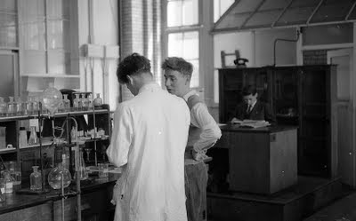 30/08/200912/04/2020 By shendyNo Comments May/June 1954. A proper 1950’s chemistry lab – white coats, glass jars, tubes, and the tutor sat at his desk reading a book. All that’s missing is bubbling jar of something toxic. Note complete absence of safety features.